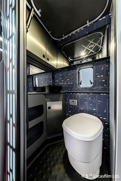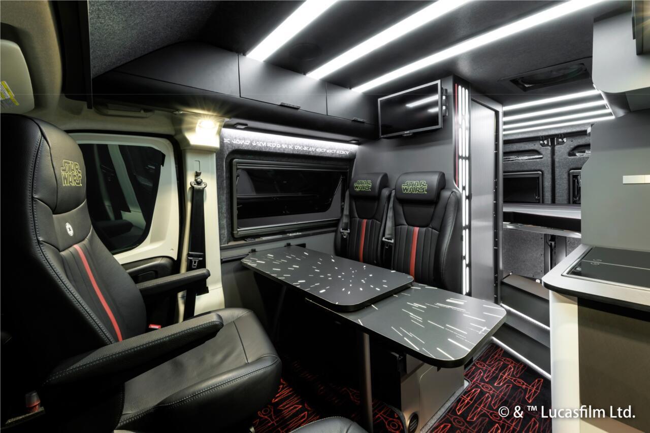 メタリックブラックのキャンピングカーの中にスター・ウォーズの銀河が広がっている、『スター・ウォーズ』シリーズ公式ライセンスキャンピングカーです。