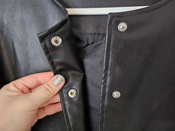 このジャケットの最大の魅力は、程よい光沢感のあるフェイクレザーが高見えすること。シルバーのボタンが全体のアクセントになっておしゃれ見えするだけでなく、裏地付きで防寒性もしっかりあります。