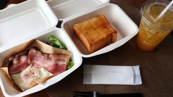 まず試してほしい定番のメニューが、この「ベーコンエッグ&厚切りバタートーストセット」。テイクアウト商品は、それぞれが紙製ケースにきれいに収められていました。