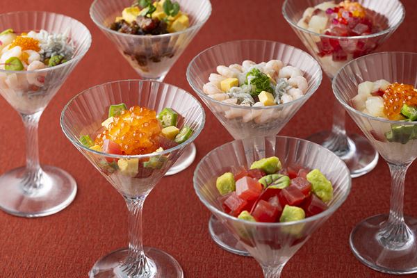 鮪、鮭、甘えび、いかオクラなど10種類を超える食材をラインナップ。お好みの食材をグラスに盛り付けて、オリジナルの海鮮パフェを作ることができます。※ディナー限定。いくらはディナー限定“選べる1名1皿限定メニュー”から。