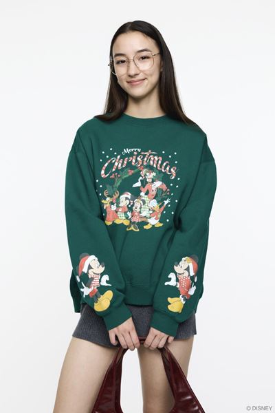 クリスマスの服を着て集ったミッキー&フレンズのスウェットは、クリスマスカラーで展開。