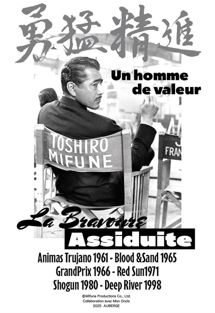 ジーンズは三船が1950年代にはいていたものをイメージソースに制作した2種類のブラックデニム。コインポケットの裏には、三船プロ協力のもと、三船が実際に愛用していた洋服の生地の一部をあしらった。また「もしパリのチャイナタウンにあるミニシアターが三船映画のポスターを作ったら?」というコンセプトにもとづき、架空の三船映画のTシャツを制作。YouTubeでは、AUBERGEのデザイナー・小林学が今回のコラボについて語る動画が公開中だ。