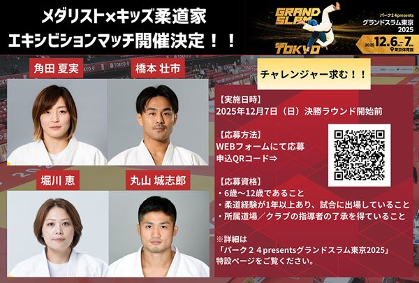 12月6日(土)と7日(日)に東京体育館で開催される「パーク24presentsグランドスラム東京2025」の大会2日目に「メダリスト×キッズ柔道家エキシビションマッチ」が開催されることが決定した。