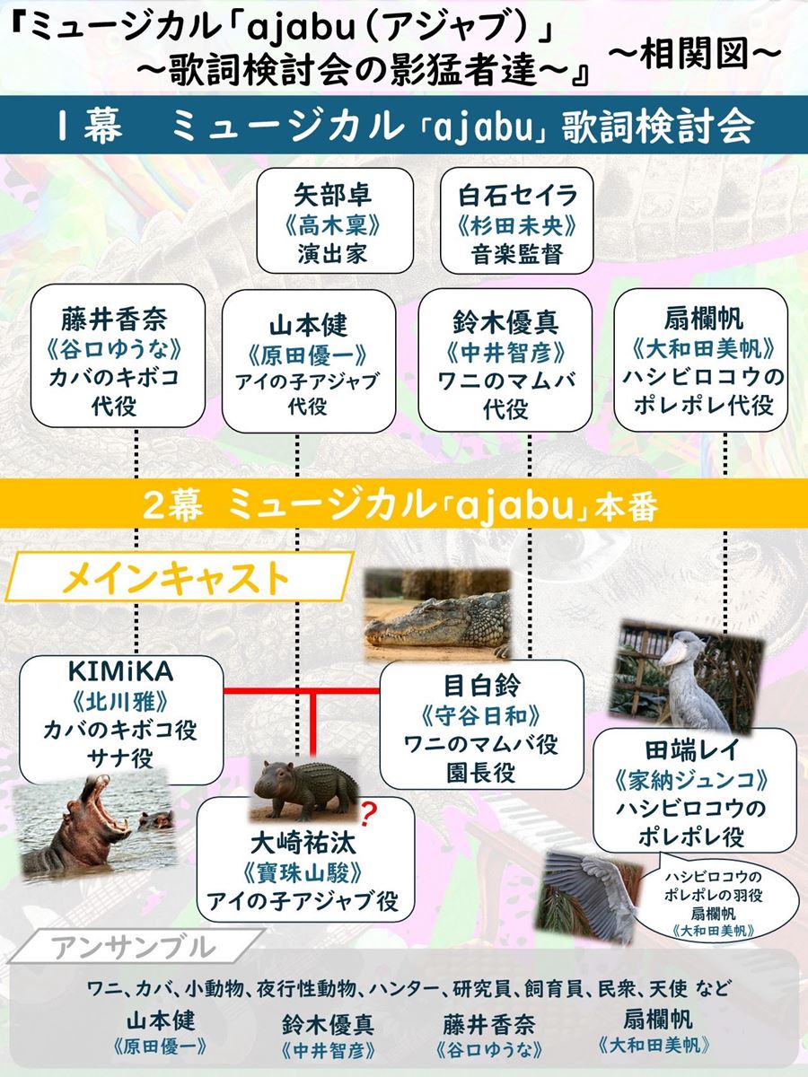 第二幕で上演されるミュージカル「ajabu(アジャブ)」は、カバとワニの禁断の恋によって生まれた人造動物アジャブが、動物の仲間たちと共に人間のエゴに立ち向かう物語。その演出家と音楽監督、そしてアンサンブルキャストの面々が、最も合う歌詞を見つけ出そうと試行錯誤する“歌詞検討会”の様子を描くのが第一幕だ。歌詞検討会の参加メンバーを演じるのは、原田優一、中井智彦、大和田美帆ら、実際にミュージカルの舞台で活躍する俳優たち。一方、ミュージカル「ajabu」のメインキャストは寶珠山駿や家納ジュンコらストレートプレイを中心に活躍する俳優たちが担い、歌詞検討会チームの面々はアンサンブルとして舞台を支える。