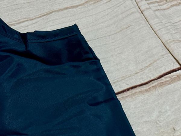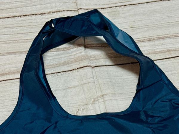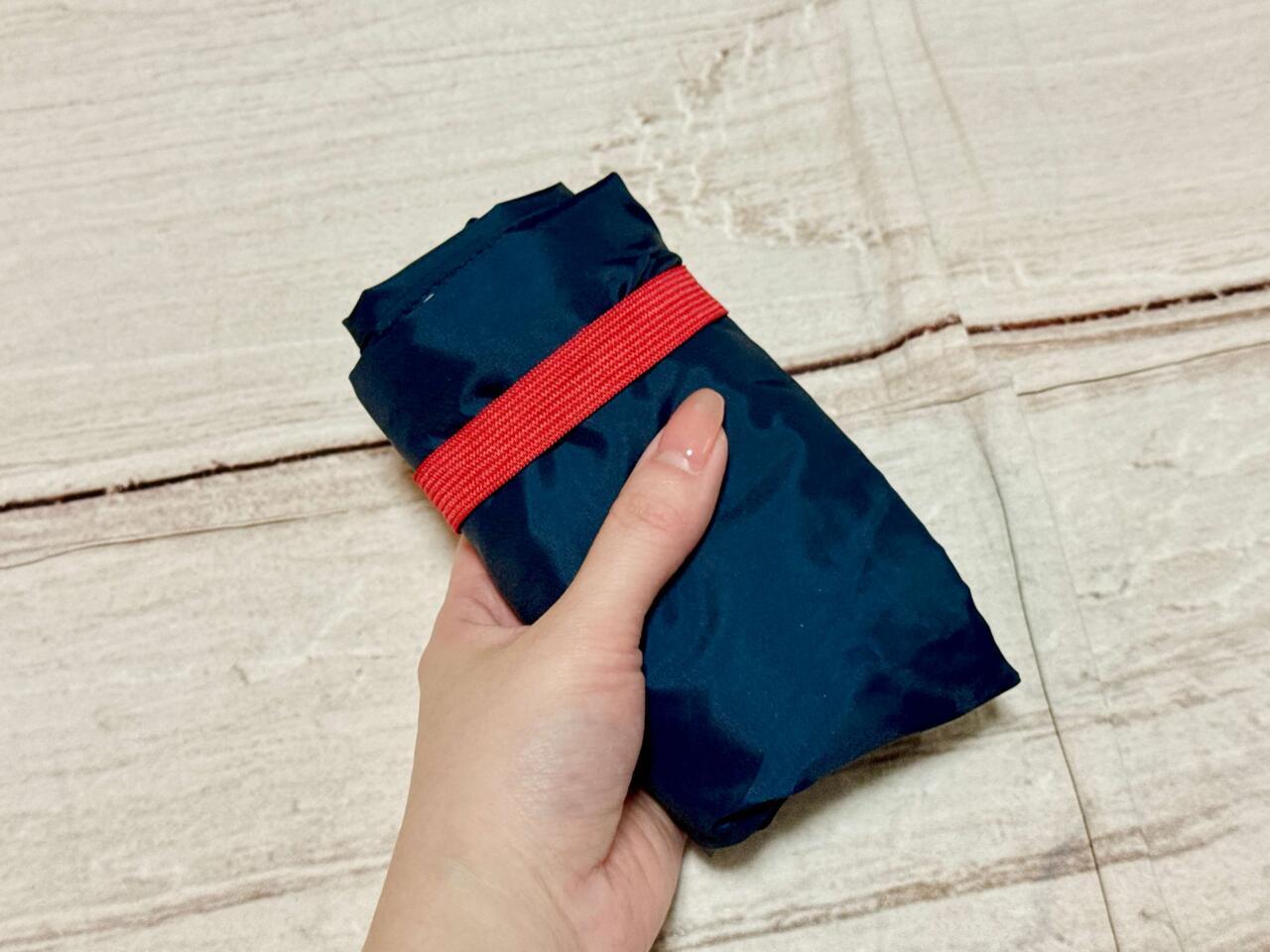 また、前面の左下にはゴムバンド付きで、こちらもエコバッグをたたんでまとめる際に使えます。2種類のたたみ方ができるのは珍しいですよね!持ち歩く際に収納するバッグの大きさに合わせてたたみ方を変えられるところがGoodです。