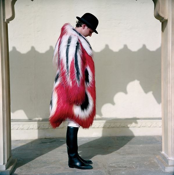 英国紳士を連想させる黒いハットに、赤・白・黒の大胆なマントをまとい、虫眼鏡で生物を観察する姿は、知性と遊び心が同居する独特の存在感を放つ。さらに、ダーウィンの衣装は、何十種類もの色に染めた毛をカツラと同じ技法で植え込んだという石岡瑛子執念の造形となっている。