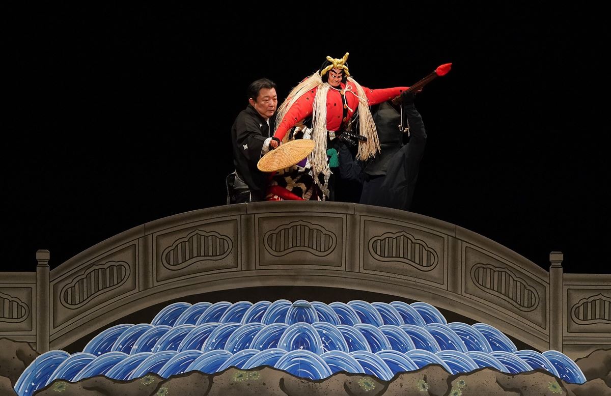 もちろん、上演演目もとても魅力的。幕開きは、旋律的な部分の多い演奏で人形の舞踊的な演技が繰り広げられる景事物が登場。近畿圏の四季の情景を春・夏・秋・冬の4つの場面に綴った『花競四季寿(はなくらべしきのことぶき)』のうち、春の場面にあたる『万才(まんざい)』だ。京都の町並みを背景にふたりの芸人が新春を寿ぐおめでたい一幕。舞台は、正月を迎えた京都。町に門松が立ち並び、清々しい空気が漂う。そこへ芸人の太夫と才蔵がやってくる。ふたりは新春を祝い、鼓の音をうららかに響かせながら寿ぎの舞を見せ、商売繁盛、子孫繫栄を祈る。