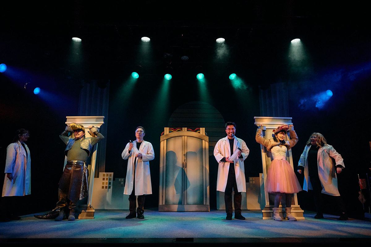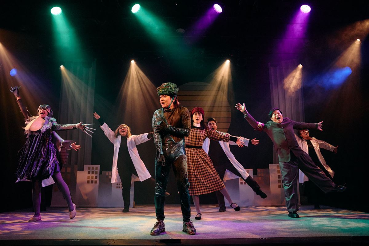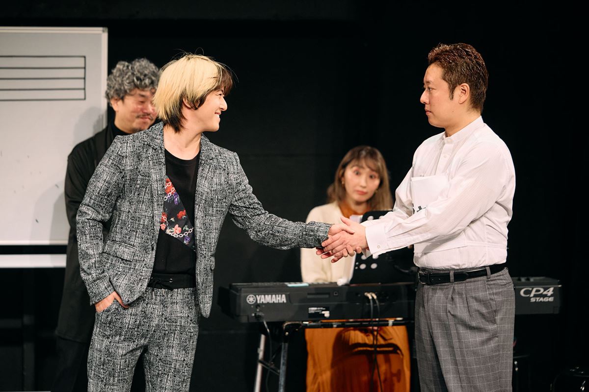 そして2幕では、1幕で歌詞を検討していたミュージカル『ajabu』がいくつかの場面を抜粋するのではなく、フルに演じられていたことにも驚かされた。その舞台セットやストーリーの設定・展開も、ミュージカル&演劇ファンなら思わずニヤリとしてしまうもの。1幕・2幕を通じて、有名ミュージカルやテレビ番組、アニメ作品などを想起させる小ネタがふんだんに盛り込まれているのだ。「もしやこれは……」「これはあの作品っぽい」と思わず深読みしてしまう楽しさは、ミュージカルをはじめエンターテイメント好きな人の心をくすぐるポイントにあふれていて、たまらない。ミュージカルでしばしば観られる、衣裳を早替えして次々と多くの役柄を演じていくアンサンブルのようすがステージ上で展開されていることにも注目だ。1幕で大活躍だった山本たちが、2幕ではアンサンブルとして「1幕でああいうふうに言っていたのは、こういうことか」としっかりアンサーを提示していることも含めて、作劇の妙と言うべきだろう。