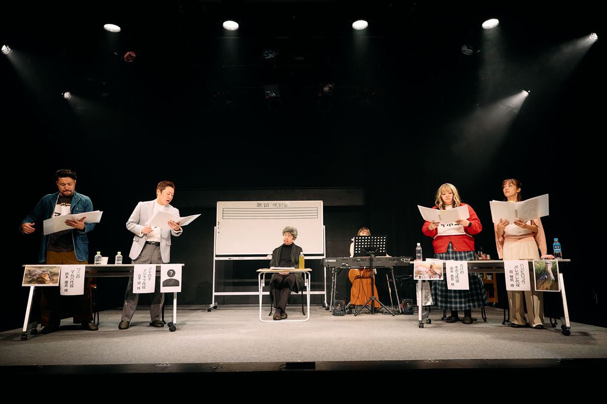 1幕は歌詞検討会が進行中であるという場面から始まるのだが、まず原田優一が自身のポテンシャルを見せつけるかのようなソロで観客の耳をわしづかみにする。原田を筆頭に中井・谷口・大和田と、ミュージカルでの活躍がよく知られている彼らは、歌声の素晴らしさはもちろんのこと、4人ともコメディセンスが冴えわたっている。歌詞や役柄、検討会の合間に繰り広げる雑談に至るまで、表情や会話のテンポのおかしさときたら。客席のあちこちから笑い声が響く。