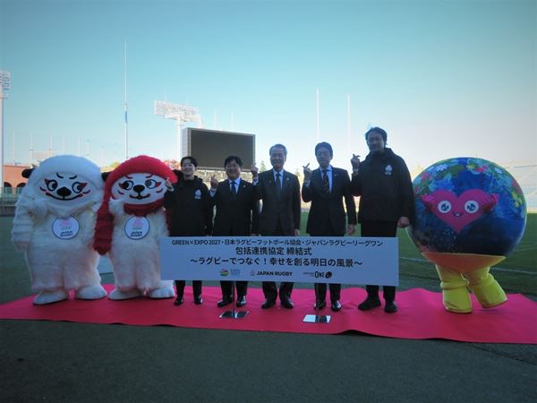 11月28日・秩父宮ラグビー場にて『GREEN×EXPO 2027・日本ラグビーフットボール協会・ジャパンラグビーリーグワン包括連携協定』締結式が行われた。本連携協定を通じ、現在予定している施策は3つ。1.ラグビー選手による「Blooming RING Action」への参加。2.ラグビーの試合会場等における『GREEN×EXPO 2027』の情報発信。3.『GREEN×EXPO 2027』会場となる旧上瀬谷通信施設(横浜市)での日本ラグビーを象徴する桜の木の植樹式実施である。