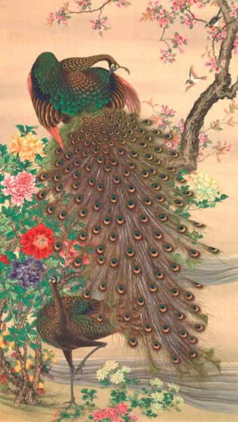 また、太平の世を知らせる「鳳凰」や、長寿の鳥とされる「鶴」、夫婦和合の鳥と考えられている「鶺鴒」など、鳥が舞う理想の世界も特集する。自由に空を飛べる鳥たちは、人間が到達できない神々の世界からの使者とされ、神聖なものと考えられてきた。こうした鳥のモチーフは、おめでたい松や牡丹などと組み合わせて描かれたが、たとえば岡本秋暉の《孔雀図》のように、9つの徳を備える鳥とされる孔雀と、富貴を象徴する牡丹を合わせた構図は定番だ。