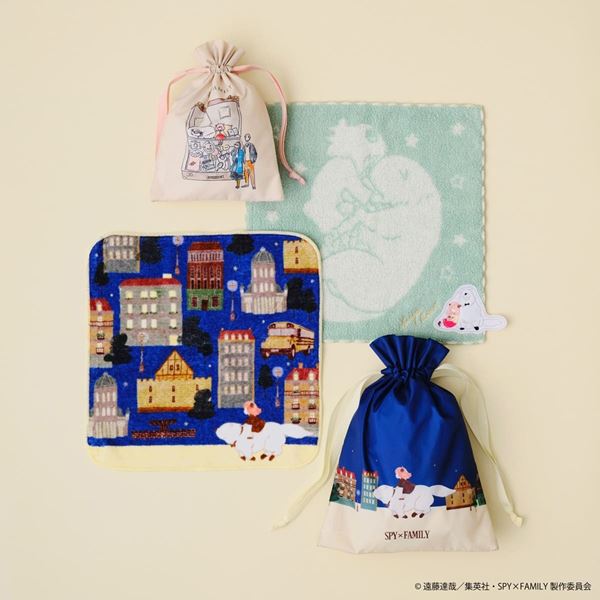 アーニャのにやり顔がたまらない「よゆうのえみ」を大胆にデザインしたポーチ&マグカップや、夜の街をアーニャとボンドが駆け回る姿を描いた巾着やミニタオルなど、コラボならではのアイテムが勢ぞろい。