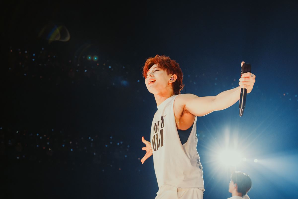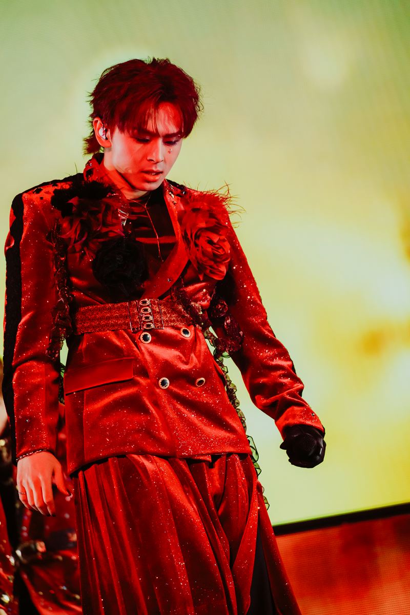 今にもその雷が落ちそうな雰囲気を感じ取った直後、会場の空気はすべて消灯。HAYATOの低音ボイスでの<「OPEN」>が響く『OPEN』では、その声をきっかけに4人がセンターステージにカラフルなセットアップ姿で登場。各々がカメラを挑発するように見つめると、会場からは大きな歓声が上がる。そして、大サビ前では再びHAYATOの<「OPEN」>を合図にダンスブレイクがスタート。光の柱が降り注ぐセンターステージで一糸乱れぬダンスを披露した。