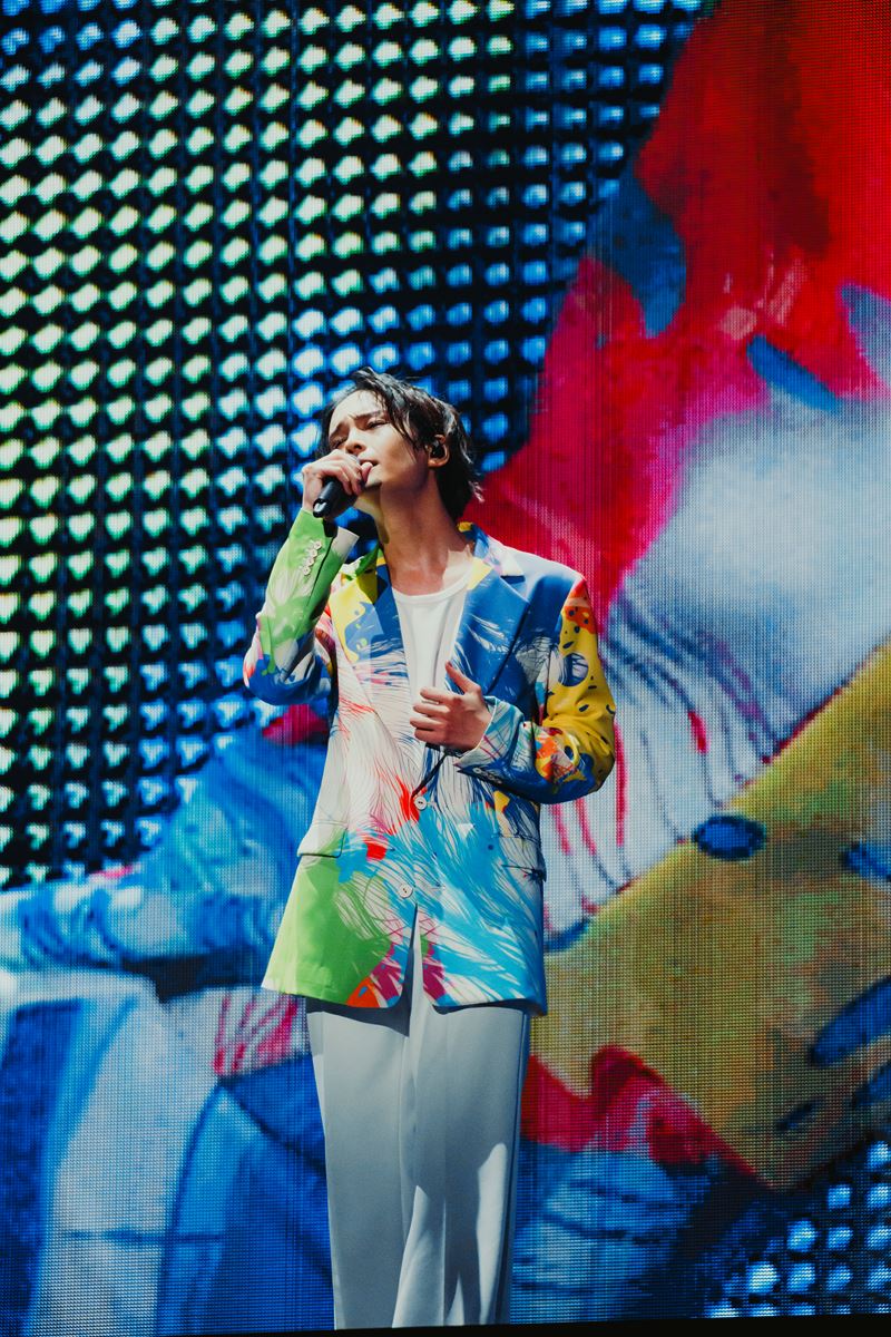 会場が暗転するとオープニング映像の続きが再び流れる。今度は5人が天高く手を伸ばし、光(LUMINA)に手をかざしていた。すると、会場のペンライトがポツリポツリと灯っていく。そして、その光が広く会場全体に伝播する。最後には真っ白なスクリーンへと繋がっていき、その奥からは白のスーツにカラフルなペイントが施された5人の姿があった。