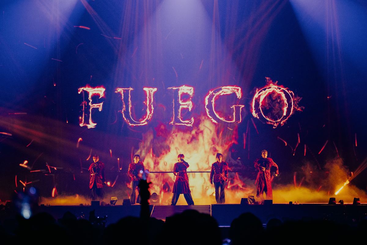 その勢いのまま和のテイストをオリ混ぜた『Turn it up』、光に合わせたアクセントダンスからスタートし、息遣いを感じさせる表情や動きがセクシーな『BOOM BASH』、TETTAが「これがラストスパートです! 俺たちについて来いや!」と呼びかけてスタートした5人の行きの揃ったダンスが魅力の『DOMINO』を披露。SWAGのボルテージが上がりっぱなしの楽曲が続く中、再び炎が上がる中で披露した『Fiesta』までをノンストップで見せる。