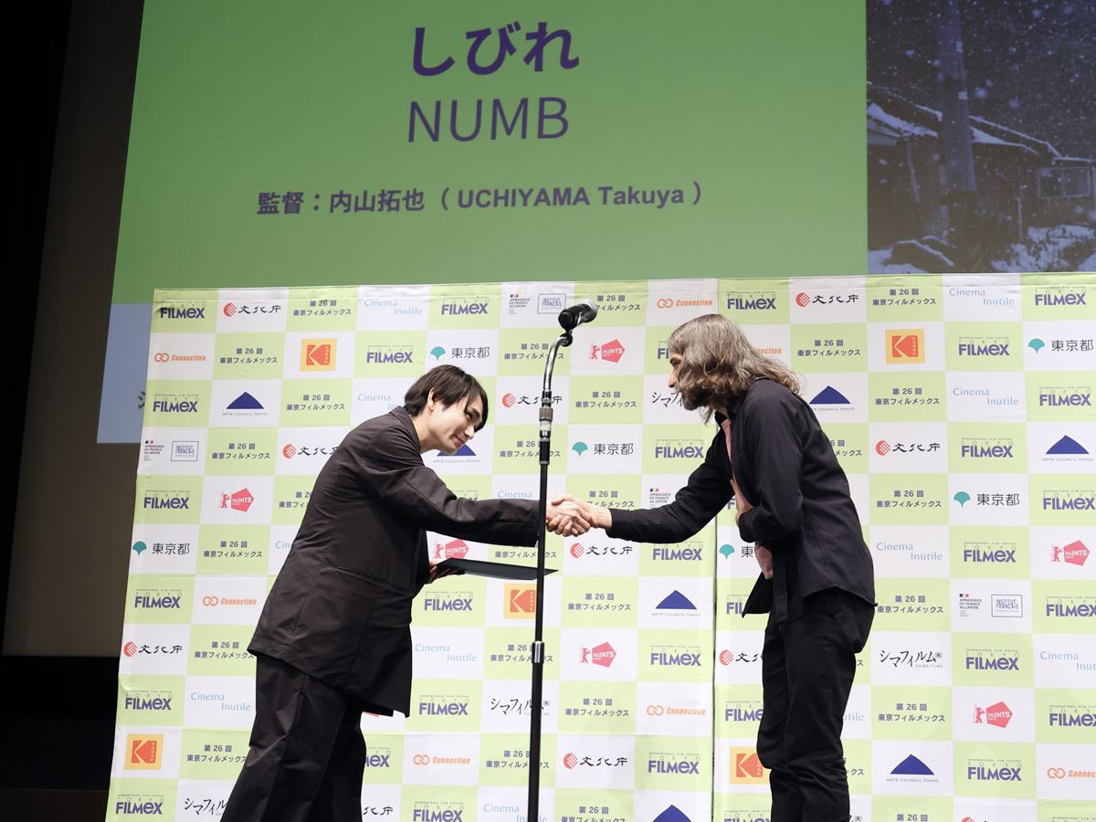 審査員特別賞は、内山拓也監督『しびれ』が受賞。会場に登壇していた内山監督は、「まずは撮影の光岡さん、照明の阿部さん、録音の白取さん、美術の福島さん。全員の名前をあげる時間をいただけないので、それが大変悔しいというか心苦しいのですが、全てのスタッフ、キャストの美しい仕事を誇りに思っています。また、これまで私の人生に携わってくれた全ての方々に感謝申し上げます。この映画は私の個人的な経験に根差している映画で、田舎の貧困層に生きるひとりの少年の姿を映し出しながら、経済的なことのみならず、社会のあらゆる階級に生きる心の貧困の存在、その存在に光をあて、祝福することを目指しました。国内外問わず、様々な状況下の中であらゆる方々が生きていると思うけれども、そういった方々が心穏やかに映画を楽しめる世の中に少しでもなることを心から願っています」と語った。