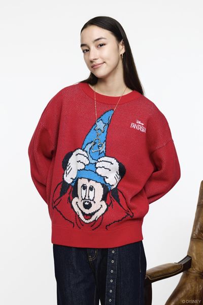 ミッキーをジャカードで編み立てたニットトップスは、大胆なデザインに。