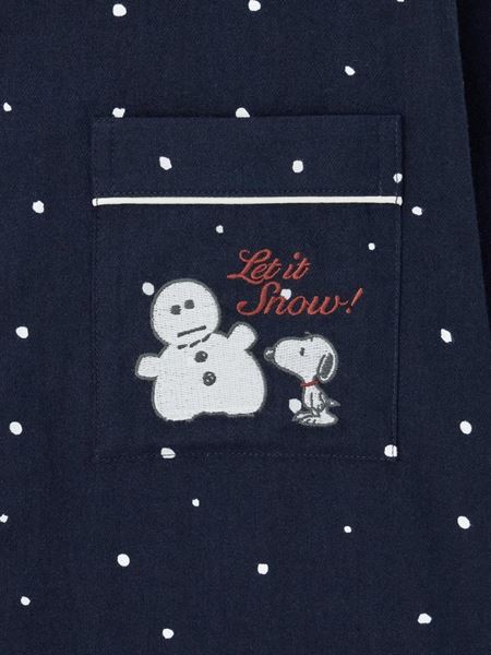 胸ポケットに、雪だるまを見るスヌーピーや、ソリを楽しむスヌーピー&ウッドストックが刺繍されています。