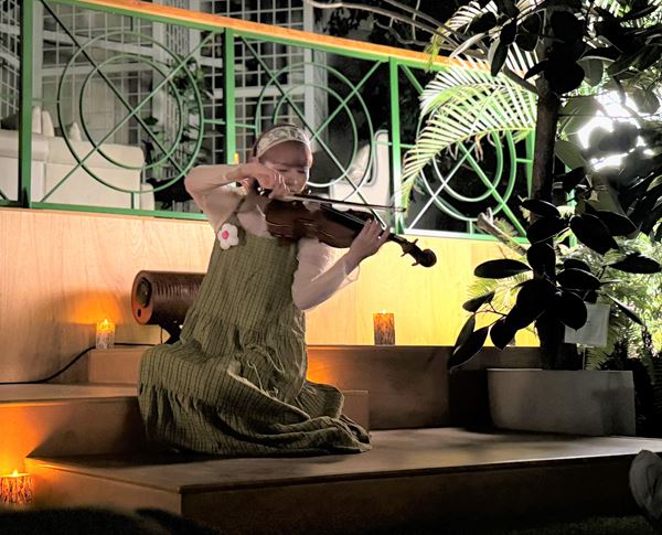 オープニングではストーリーテラーとして”ぼ〜っと博士”が登場し、深い瞑想状態に導くシータ波(脳波)の周波数を空間に発生させるところから舞台はスタートする。脳を休ませるヒーリングサウンドにのせ、ビオラの生演奏とダンスがはじまり、誰もが知っている名曲を聴きながら “何も考えずにぼ~っとする”時間が流れる。ビオラは、弦楽器の中でも明るく華やかなイメージがあるバイオリンに比べ、中低音域が豊かで温かく深みのあるやわらかい音色が特徴だ。暗くなった場内でキャンドルがゆらゆらと揺れはじめ、忙しさを忘れ、リラックスできる演出が続いていく。