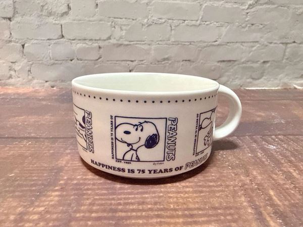 高級感のある磁器性のマグカップで、カラーはホワイト。ホワイトにネイビーで、スヌーピのイラストがプリントされているデザインです。