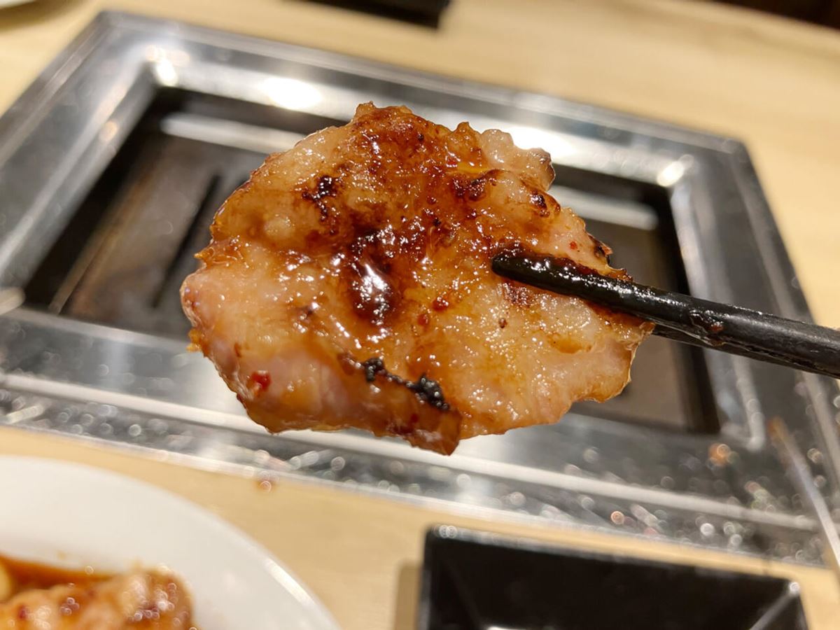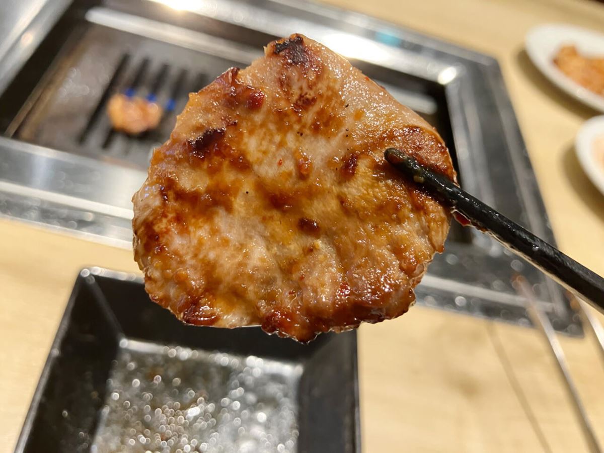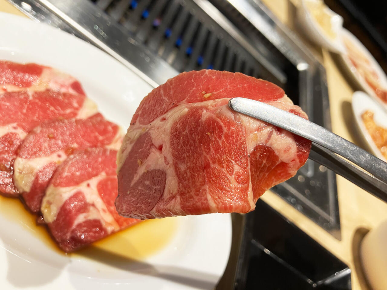 まずは「牛タンカルビ(醤油タレ)」から。タンカルビ、タン舌などと呼ばれることもある部位で、食べ放題のおかわり注文でも人気なのだとか。
