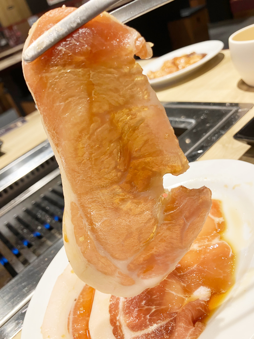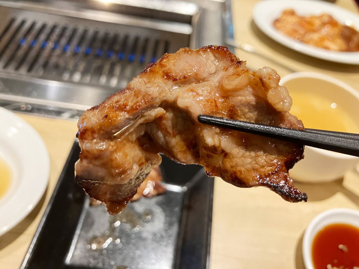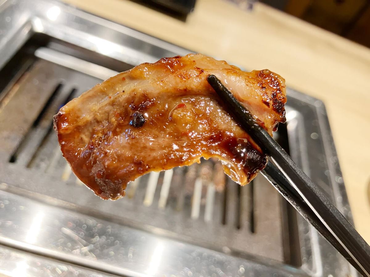 まずは「牛タンカルビ(醤油タレ)」から。タンカルビ、タン舌などと呼ばれることもある部位で、食べ放題のおかわり注文でも人気なのだとか。