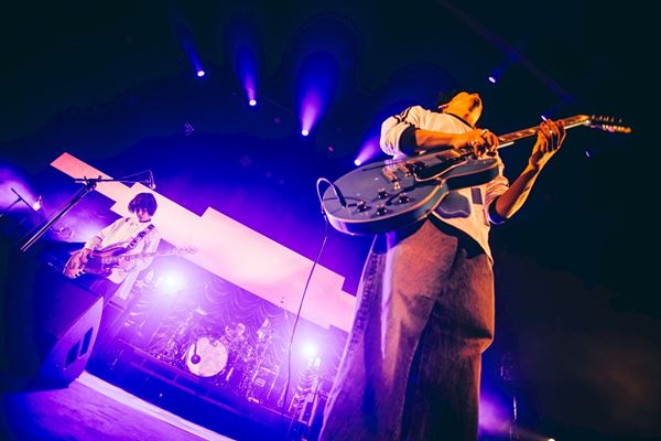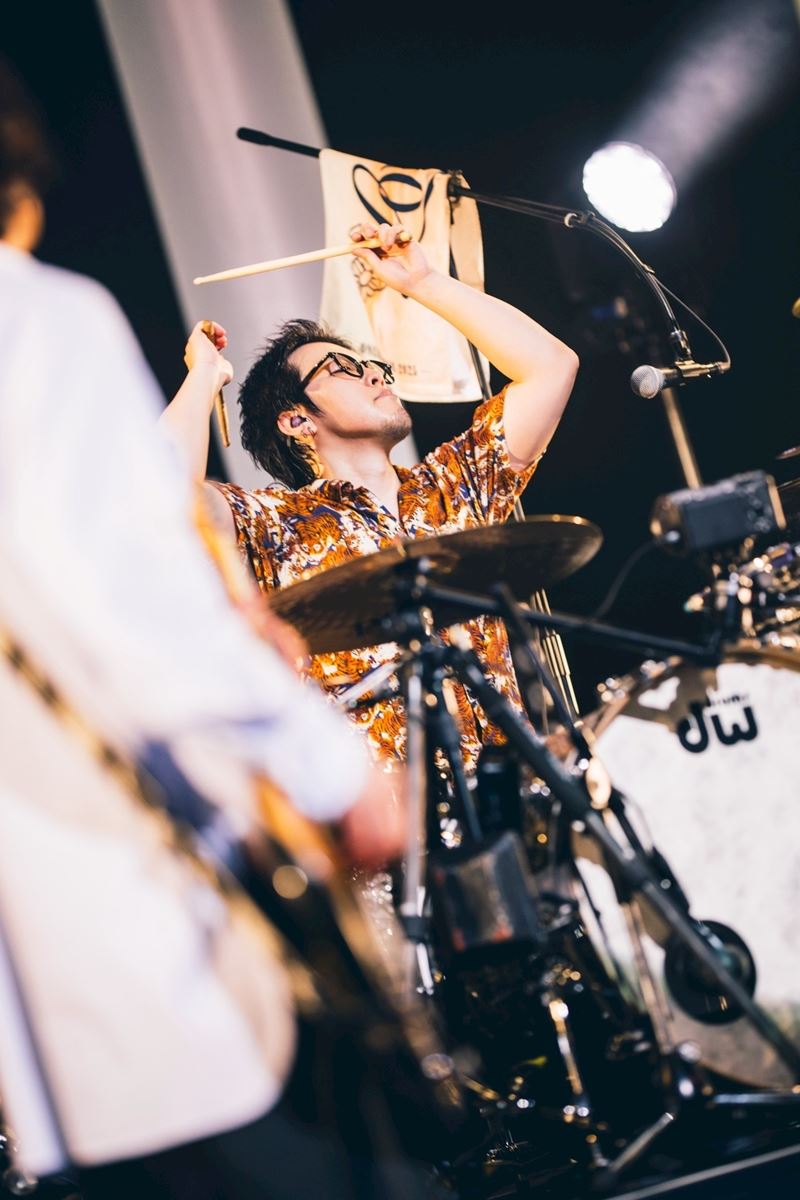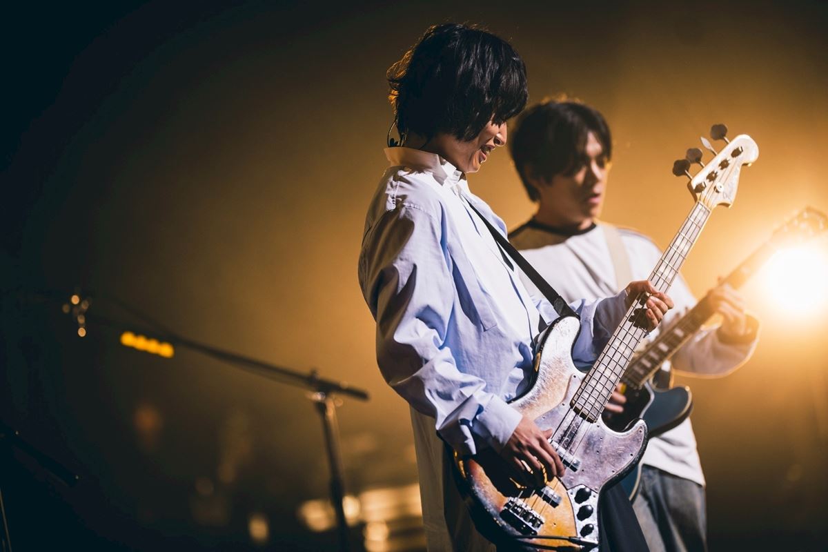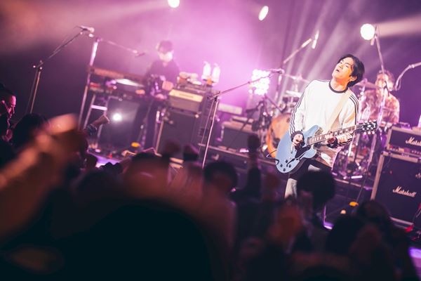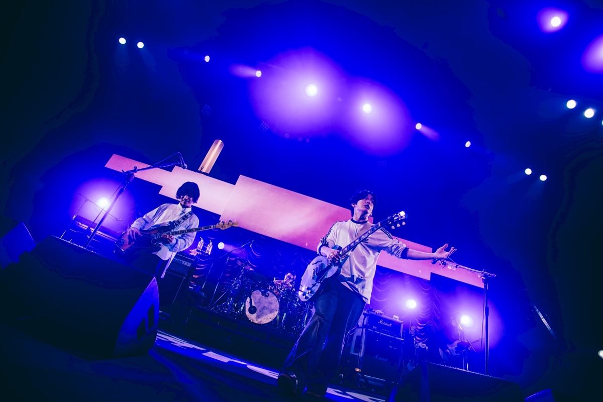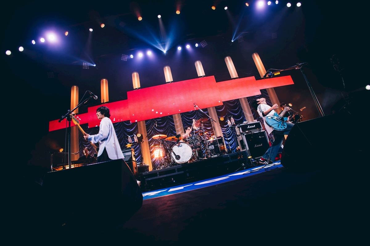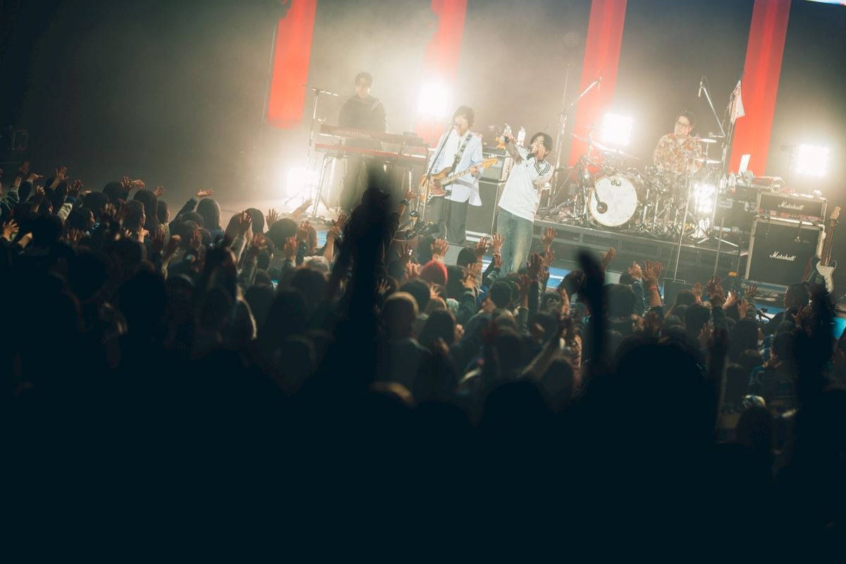 大きな歓声が響く中、十九川宗裕 (b)、前田将司 (ds)、サポートメンバーの重永亮介(key)と三浦太郎(g)、少し遅れて平部雅洋 (vo/g)が登場するが、高まる気持ちが抑えきれないのであろう。十九川はオーディエンスへ向けて大きく両手を広げ、平部は2階席や3階席も見えているぞ、とピースマークを高く掲げていく。共に行こう、というスタンスを伝え、ライブの口火を切ったのはアルバム『LOVERS』でも冒頭を飾った「ハンワライナー」だった。つまらないことは笑い飛ばしてしまおう、と軽快なリフから伸びやかなメロディーを響かせる。ふたりのサポートメンバーが加わる布陣であったが、まず驚かされたのがメンバー3人が織りなすトライアングルの強靭さだ。もともとライブ力に定評があるバンドではあるが、いいツアーをまわってきたのだろう。そこに+αでギターとキーボードの音が加わる華美なサウンドが何とも気持ちいい。