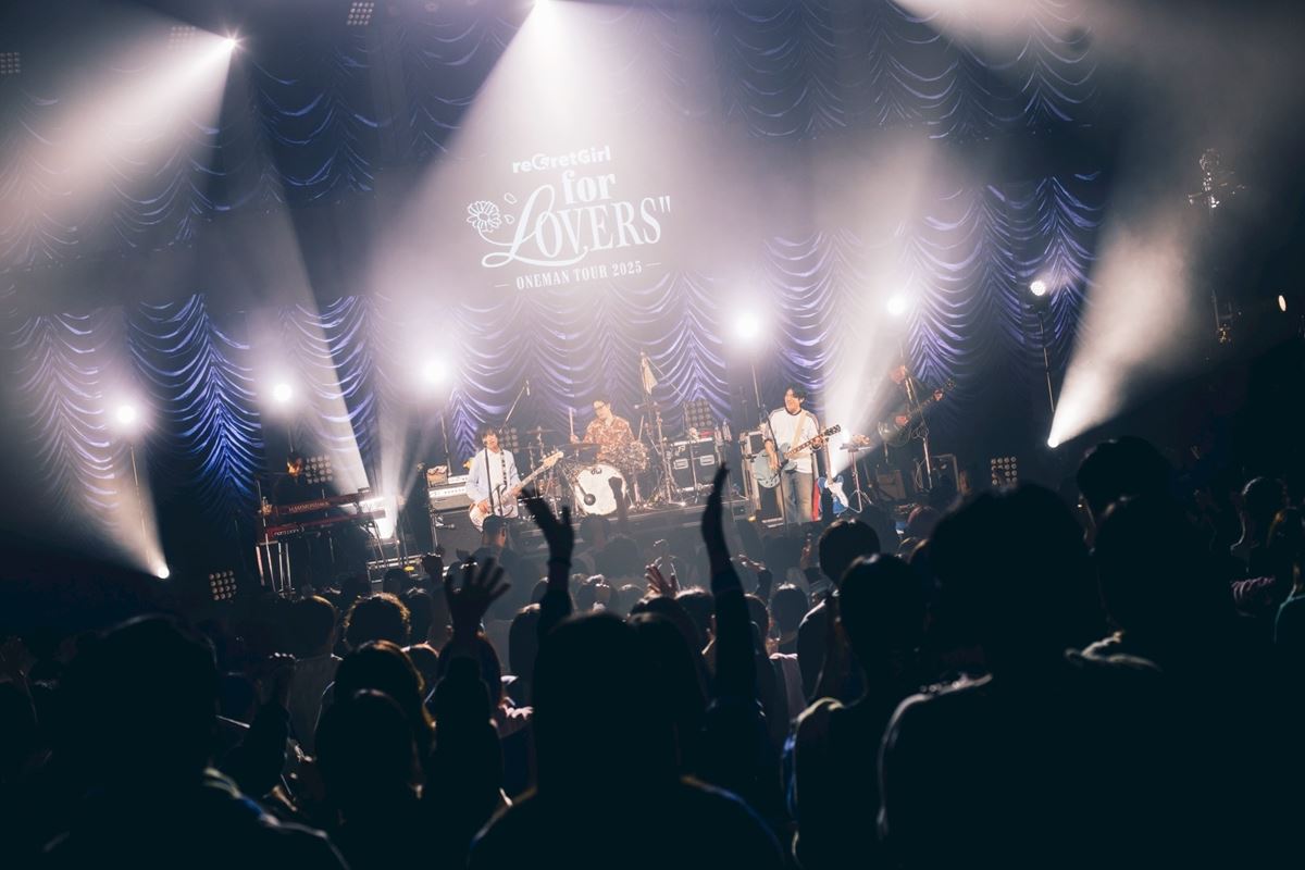 reGretGirlが、11月28日に東京・渋谷LINE CUBE SHIBUYAにて『ONEMAN TOUR 2025 "for LOVERS"』の最終公演を開催した。reGretGirlと言えば、未練や後悔といった失った恋を歌うバンドというイメージも強いが、近年はそれらを包括し、もっと大きな人間としての愛を歌うようになってきており、そういった曲たちが詰め込まれたのがフル・アルバム『LOVERS』。そんな作品を引っ提げた本ツアーは各地のライブハウスを巡りながら、終盤の3本は東名阪でのホール公演という初めての試みにも挑んだ。正念場であり、培ったモノを開花させるチャンスでもある本公演は、満員のオーディエンスへ大きな愛情を伝えながら、バンドとしてのネクストステップも感じさせる最高のパフォーマンスを見せつけてくれた。