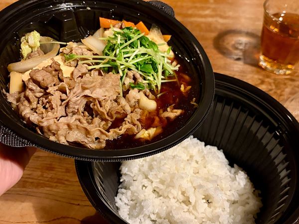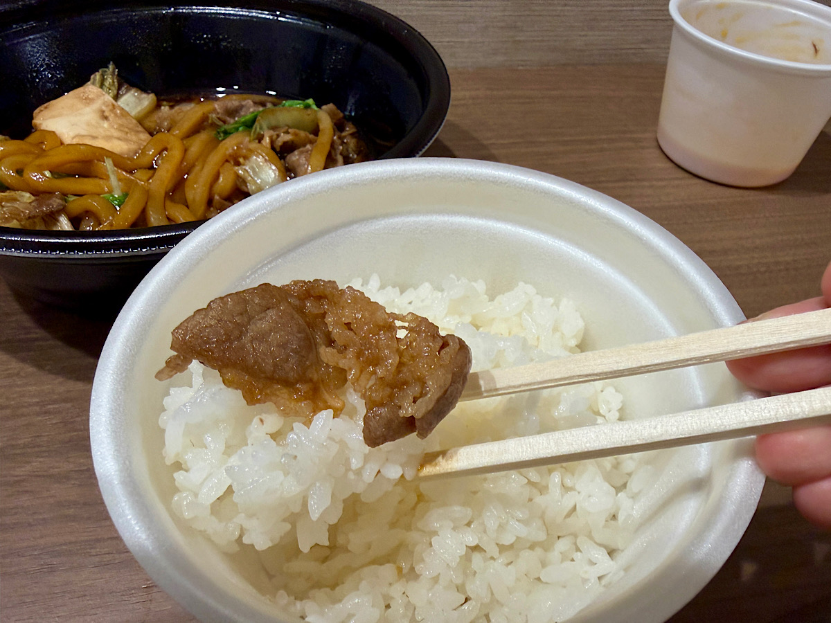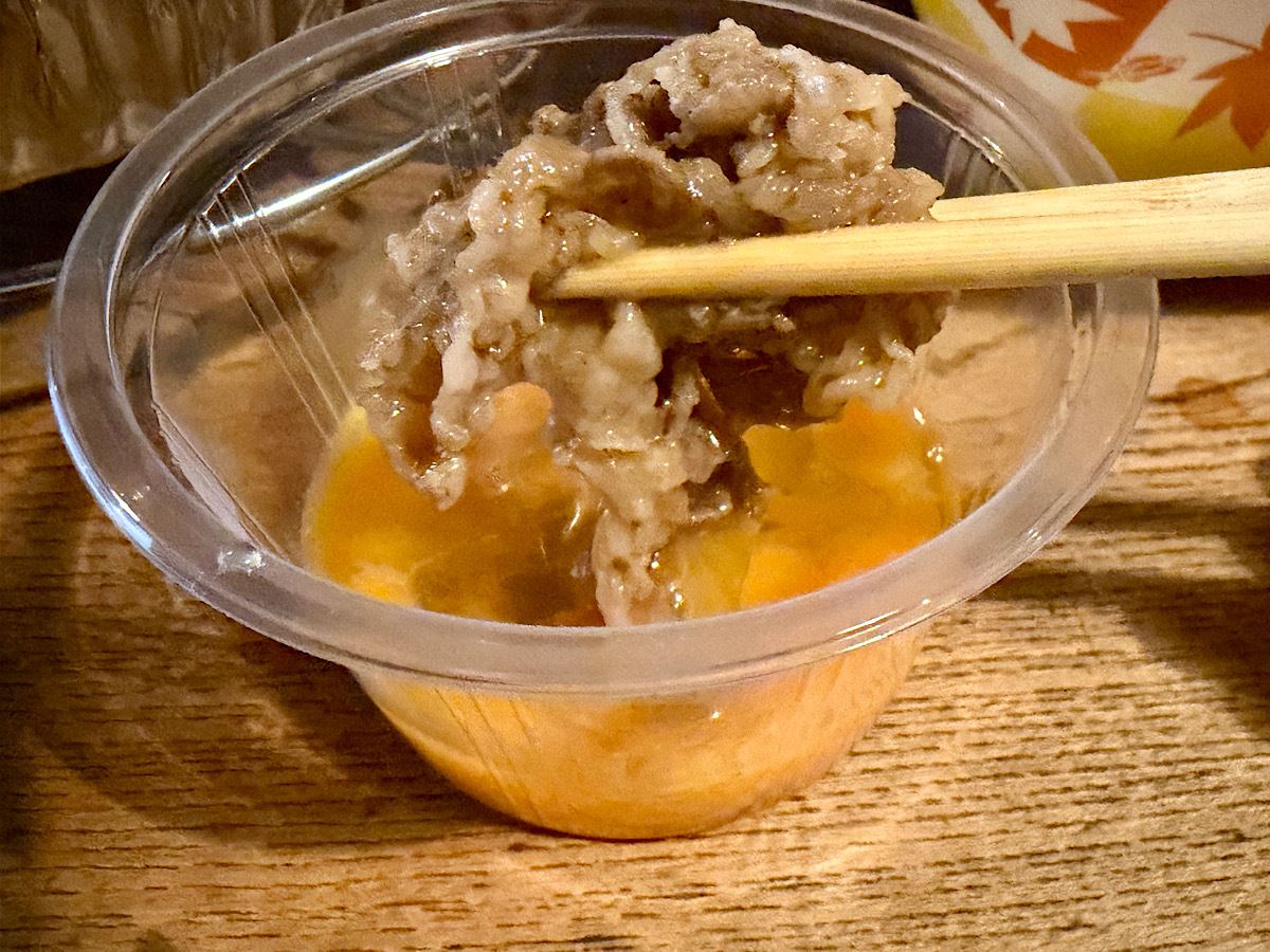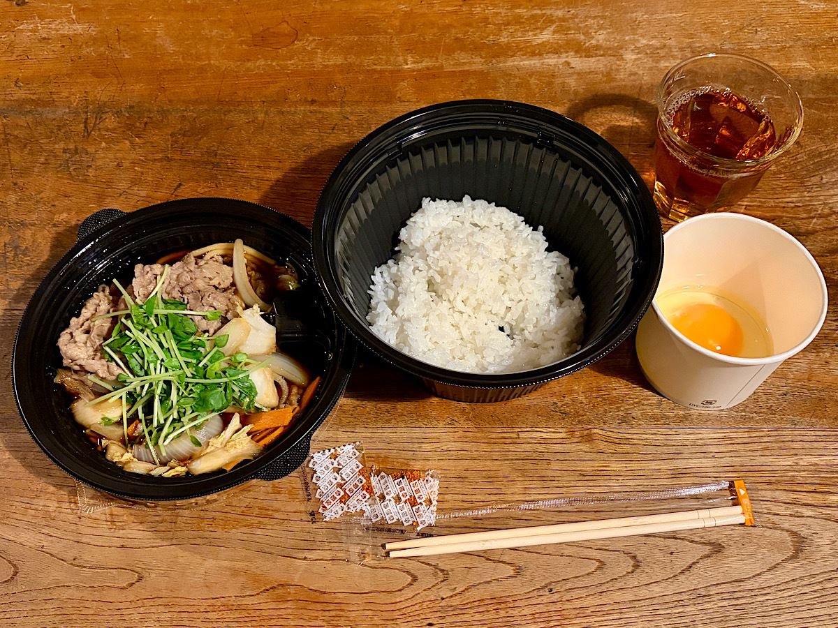ある程度食べ進めたら、牛すき鍋と生卵をご飯の上にかけて丼にして食べるのもいいですね。こういう食べ方を推奨するためのこの容器設計なんでしょうか。