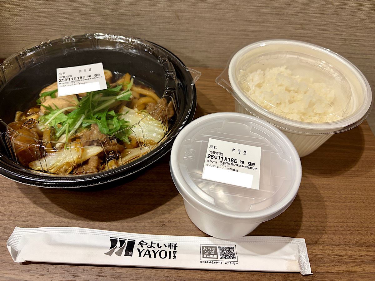 牛肉、白菜、豆腐、しらたき、うどんと豊富な具材が、やよい軒特製のすき焼きたれで煮込まれており、ご飯と生たまごがついてきます。