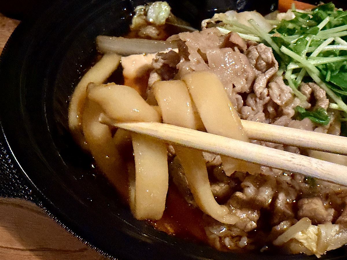 【吉野家 牛すき鍋膳】きしめんのコシはやや弱めですが、その分割り下がよく絡みます