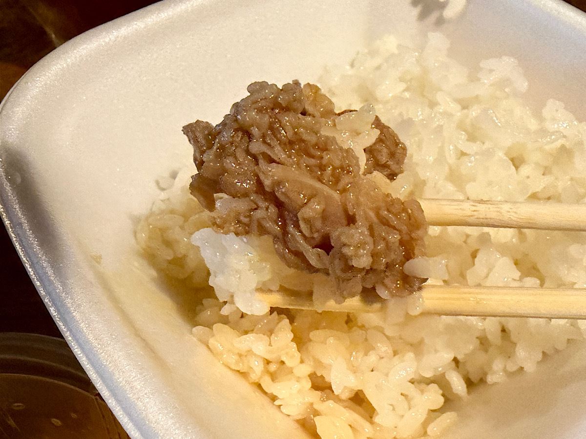 吉野家やすき家に比べてお値段が張りますが、その分量が多め(特にご飯)。お味の方も気になるので、早速食べてみましょう。