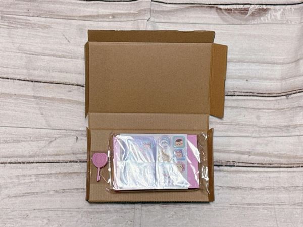 ブックケースとカギは、ダンボール製のボックスの中に入っています。開封してみると、シンプルで装飾がないケース、カギ、フレークシールが登場!