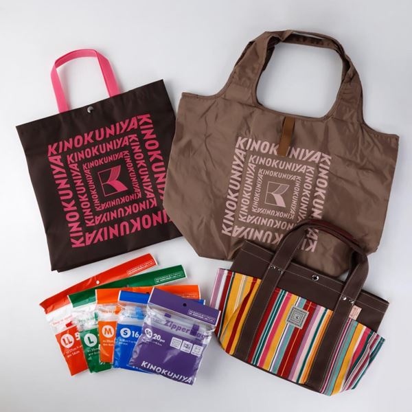 〈内容〉スライドジッパーバッグ(5個セット)、4ポケットトート(S)ブラウン、カラーエコスペシャル ブラウン×ピンク、まとまる保冷バッグ クルミ(各1点)
