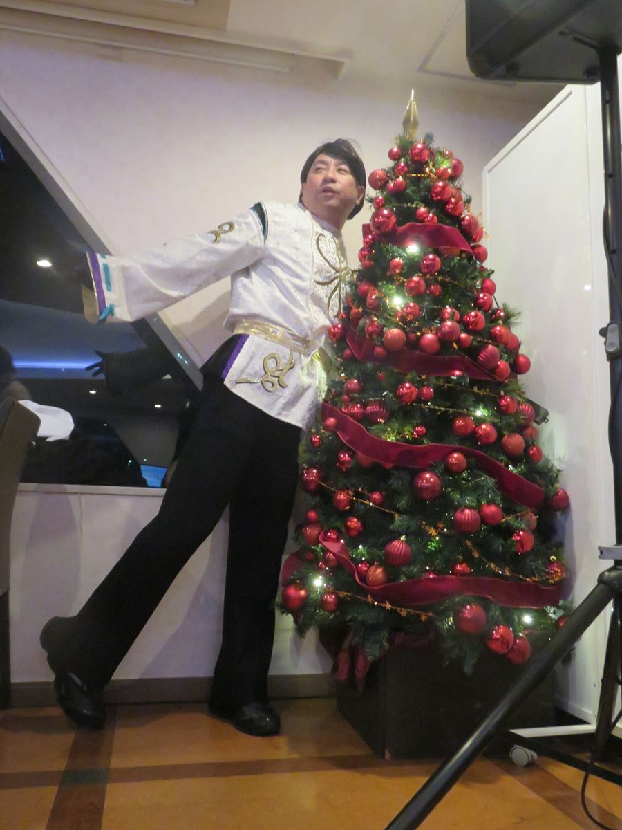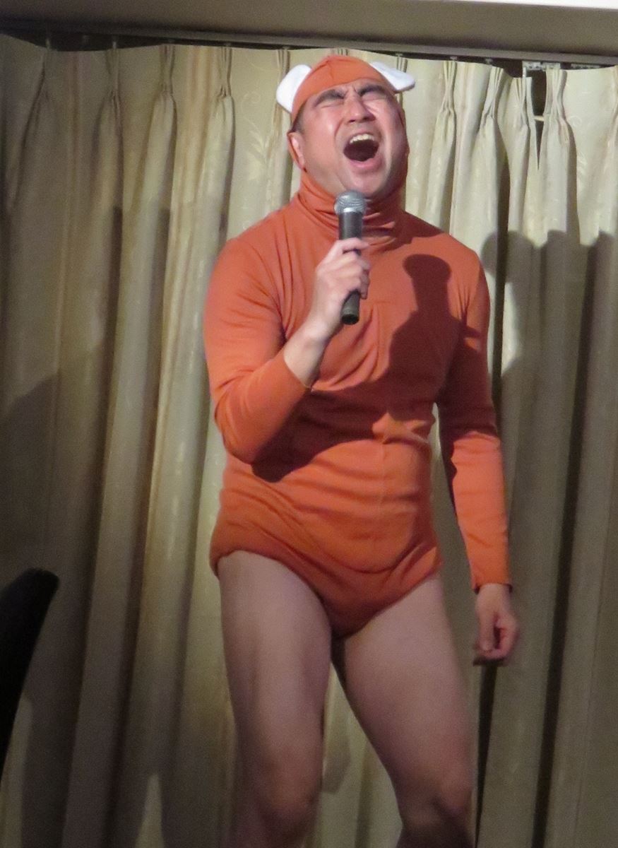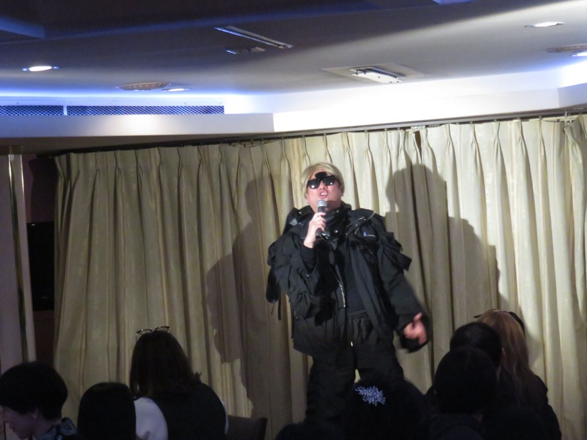 すると、とんでもない歌唱力に船内は大盛り上がり。これまでのRGあるあるツアーでは音響設備のよしあし関係なく自慢のノドを活かしてあるあるを歌いあげてきたRGですが、この日の伸びやかな声には「え、やばい、声が出すぎていた」とビックリ。今回第一興商の協力により、DAMのカラオケ音源を使用。その音響の良さに自然とつられたようで、テンションが一気にアップ。参加者が食べていたフルコースディナーの真鯛を見てすぐさま「真鯛あるある」を思いつき、Xの「紅」をチョイス。「真鯛のあるある shadows on the wall」「真鯛が見えないのか すぐそばにいるのに」と歌うに留まらず、間奏で「ギター黒鯛! ベース金目鯛! ドラム真鯛!」とノリノリ。しかし、歌い上げすぎた結果、あるあるを言う前に曲が終わってしまい、「やべえ、終わった(笑)。あるあるは“大きいやつは黒い”でした」と口上。「気持ちよくなりすぎて歌わないパターン、これRGあるあるでした」とオチをつけた。