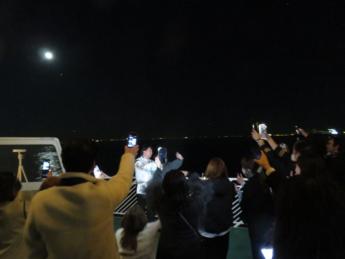 ツーショットタイムは、リクエストに応えて華麗なる羽生結づぁるで登場し、デッキのKiss and Cryで横浜の美しい夜景や月をバックに撮影。マリーンルージュに施されたイルミネーションも、結づぁるのためのKiss and Cryとばかりに参加者たちは至る所でカメラを向けた。