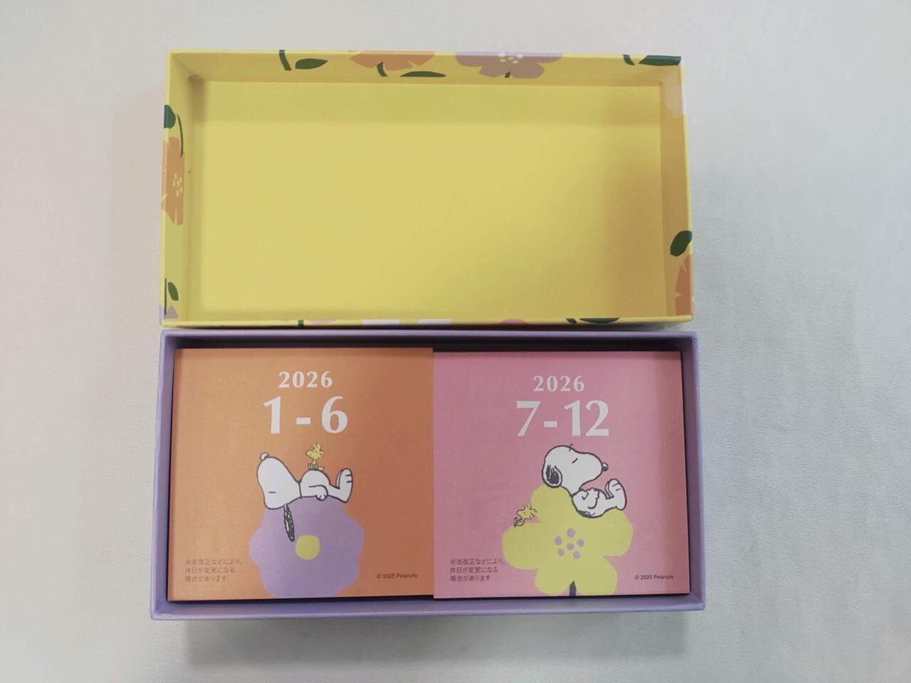 付録の内容は、鮮やかなパステルイエローの紙箱と、日めくりカレンダー上半期・上半期の2冊セットです。