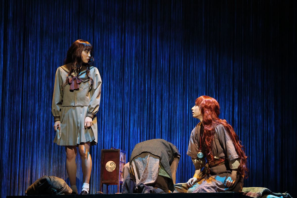 舞台はセットと大がかりなパペット、さらに映像を組み合わせて壮大なスケールで展開。ホリゾントいっぱいに広がるストリングカーテンは、異界と現実を隔てる薄膜のような境界を示したり、映像を映すスクリーンになったりと大活躍。大陸を思わせる力強い楽曲(音楽・深澤恵梨香)も多く、生演奏で舞台を盛り上げる。