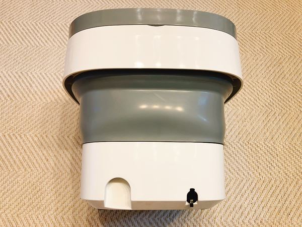 今回レビューする「折りたたみミニ洗濯機」は、名前の通りコンパクトにたためるのが魅力のひとつ。折りたたむと本当に薄くなり、棚やシンク下などちょっとしたスペースにも収納できのがいいですね◎