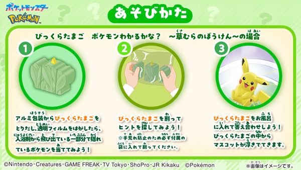 今回発売される「びっくらたまご ポケモンわかるかな?」は、“草むらでやせいのポケモンに出会う体験”がコンセプト!入浴剤は草むらの形をしており、そこからポケモンの体の一部がちょこんと飛び出しています。