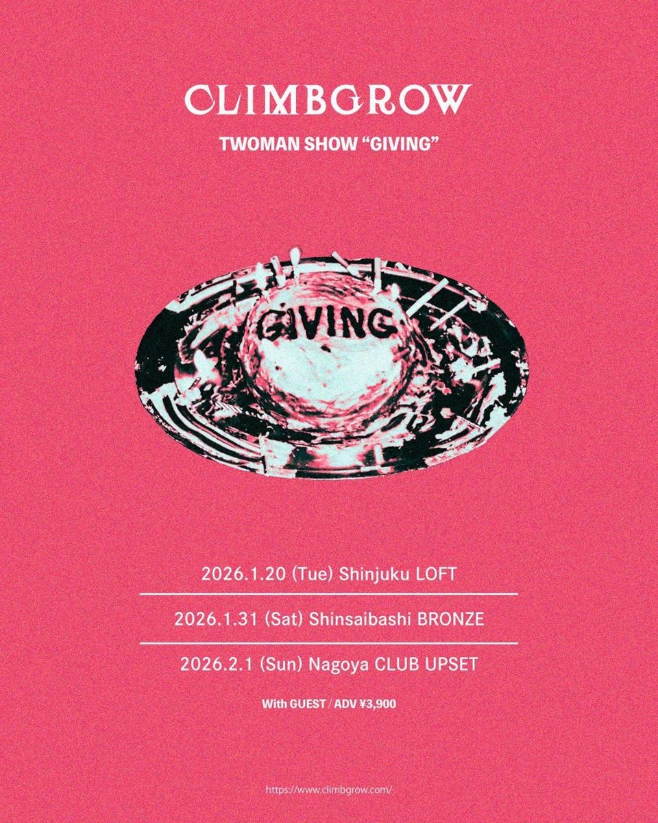 1月20日(火)東京・新宿LOFTを皮切りに、1月31日(土)大阪・心斎橋BRONZE、2月1日(日)愛知・名古屋CLUB UPSETを巡り、各地のゲストを迎えて、climbgrowと所縁ある盟友と共にロックンロールをぶち込む、2026年の幕開けを飾るツアーとなる。