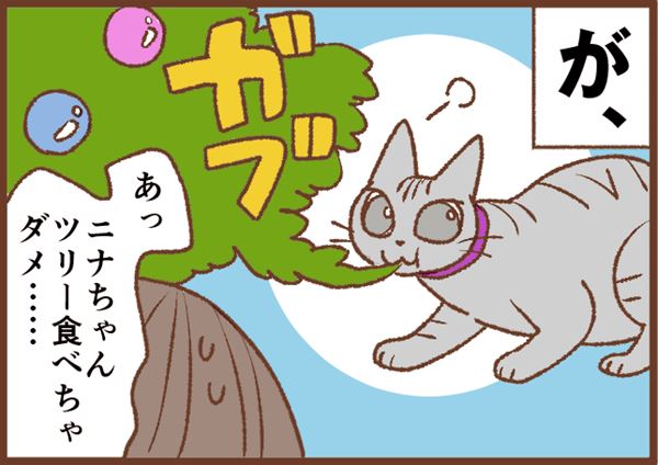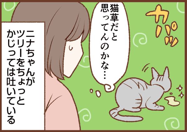 しかしニナちゃんは猫草気分でちょびっとかじっては吐いてるので(ご存じない方に念のため説明しますと、猫はトゲトゲした草を食べることで胃の中を刺激して、毛づくろいで胃にたまった猫毛を吐き出す習性があります)、ありさんなどは「冬の風物詩だな…」とか言ってるのですが、イヤな風物詩すぎるのでやめてほしい(笑)