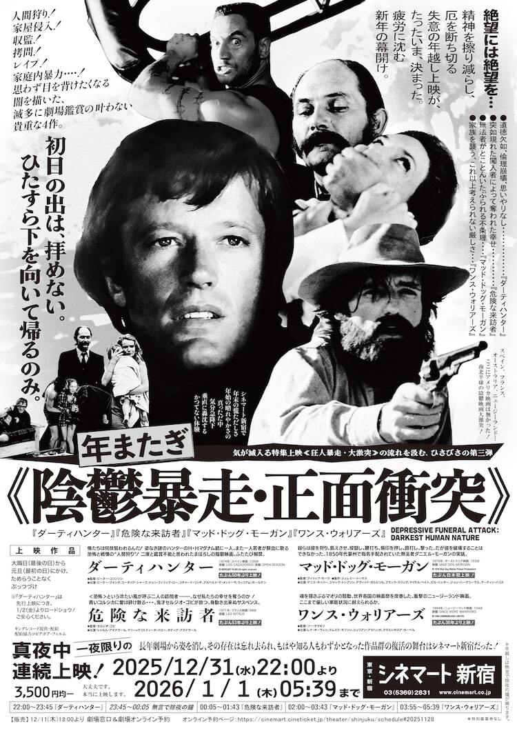 オールナイト上映「≪陰鬱暴走・正面衝突≫DEPRESSIVE FUNERAL ATTACK:DARKEST HUMAN NATURE」が、大みそかの12月31日22時から東京・シネマート新宿で開催される。