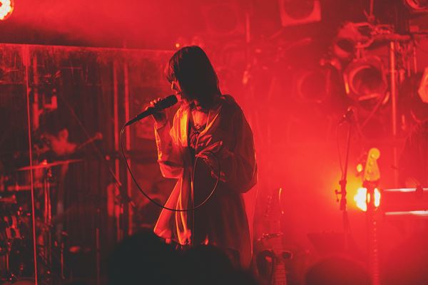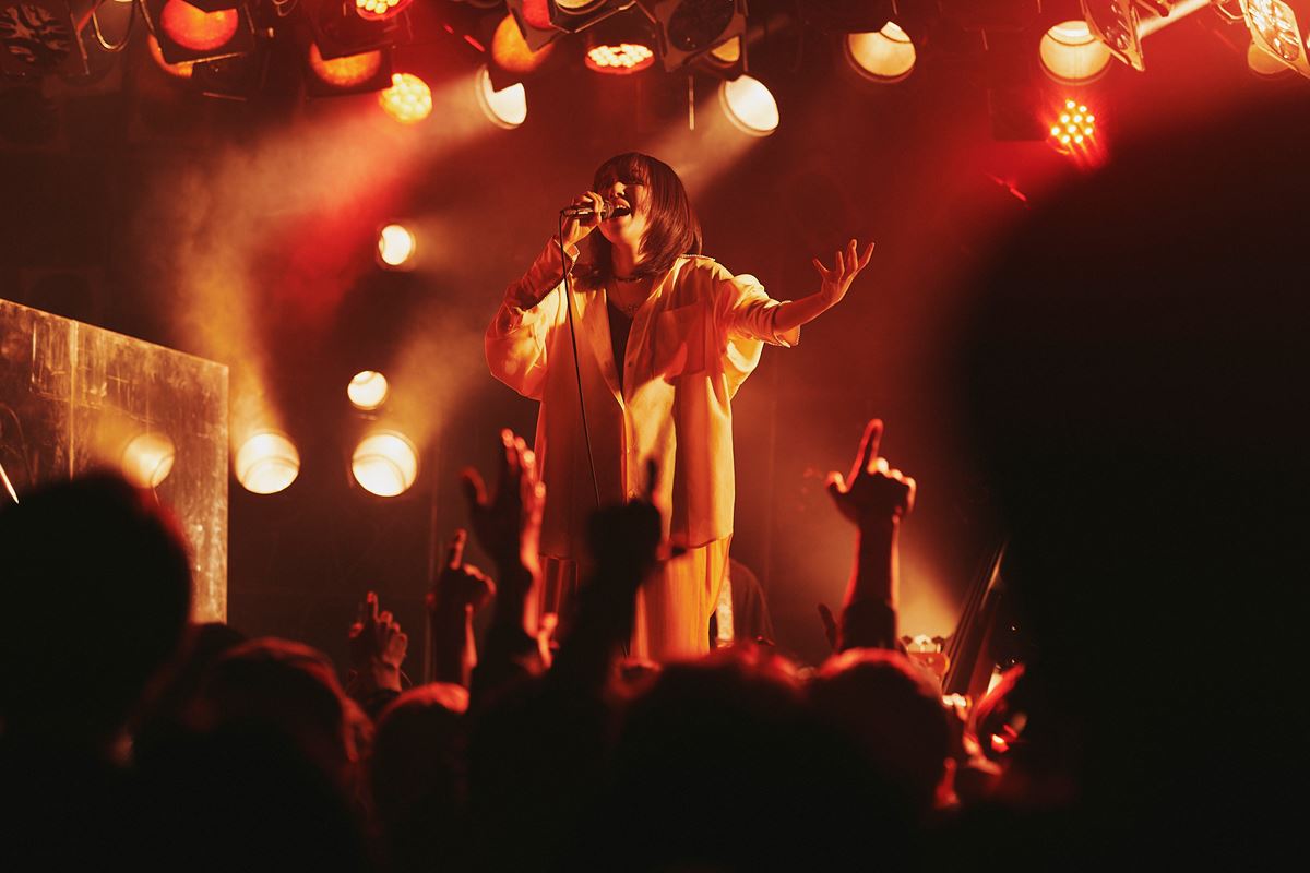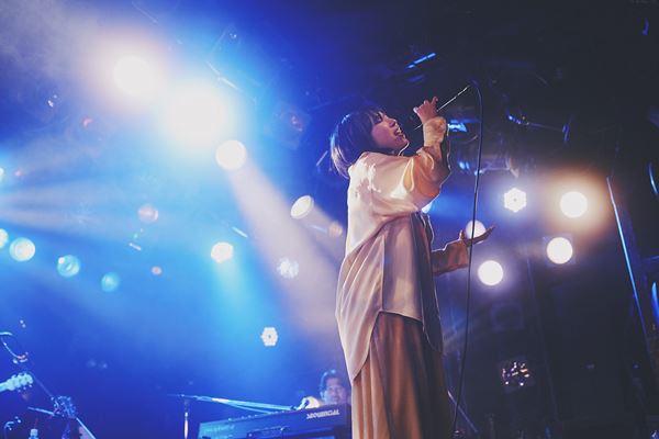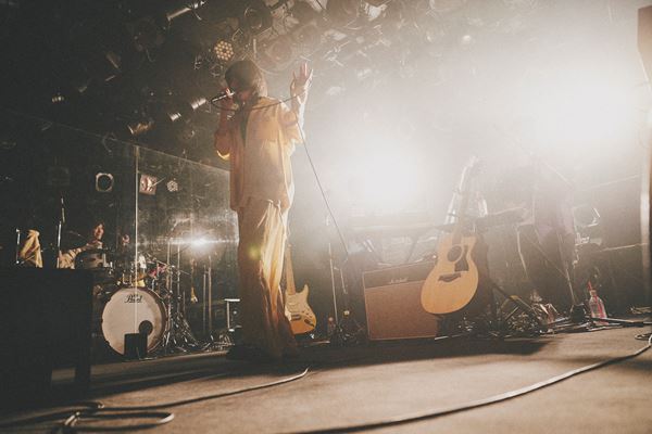 暗転するとオルゴールの音色が会場を包み込み、おとぎ話の1ページに紛れ込んだようなSEから一曲目「Discord-disco」。野田洋次郎がプロデュースし、2ndデジタルシングルとしてリリースされたこの曲。普段みせる素朴で純粋無垢な姿とは裏腹に、妖艶で大人の空気を纏いジャジーに歌う十明。憑依型とは聞いていたが、まさに十明が作り上げた変身のレシピ。ウッドベースが気持ちよく響きながら、十明のその変幻自在ぶりに一曲目から度肝を抜かれた。