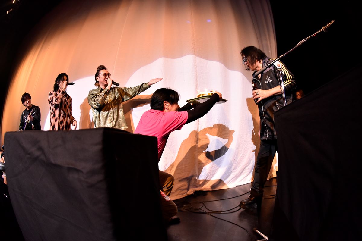 セットチェンジで幕が閉まっている間に、幕前に出てきて準備をしているDJ-INA。スタンバイOKなのになかなかBGMが途切れず「なげーな」とひと言漏らした瞬間に音が止まり、STC(木村世治、TAKA、CUTT)の3人とDJ浅井博章がろうそくに火が灯ったバースデーケーキを押してあらわれる。一瞬、びっくりした表情を見せるINAだが、「あ、そーいうことね」とすぐに納得した様子。hideの共同プロデューサーINAのバースデーは12月12日で、hideの1日前なのだ。INAの誕生日を祝ったあと、hideへのバースデーソングをみんなで歌い、DJタイムが始まった。DJブースの中にとどまらず、マイクを持ってステージをあちこち動いて、オーディエンスを巻き込んでいくINA。「FISH SCRATCH FEVER」では「DIEちゃんがこの曲をやりたいっていうのでデータをあげたりしてたんだけど、できなくなっちゃったから応援メッセージを送りたいと思います」とスマホでオーディエンスと一緒にメッセージを撮影。この動画には、緊急入院でイベントに出演できなかったDIEも喜んだことだろう。その後、DJ浅井博章が登場したり、お客さんをステージに上がらせたりと楽しく遊んだあと、「あっという間すぎたので、次はあっちのバー(会場2階のアティック)でDJやってるので遊びに来てください」とひとこと。INAのDJタイムはまだまだ続くのだ。