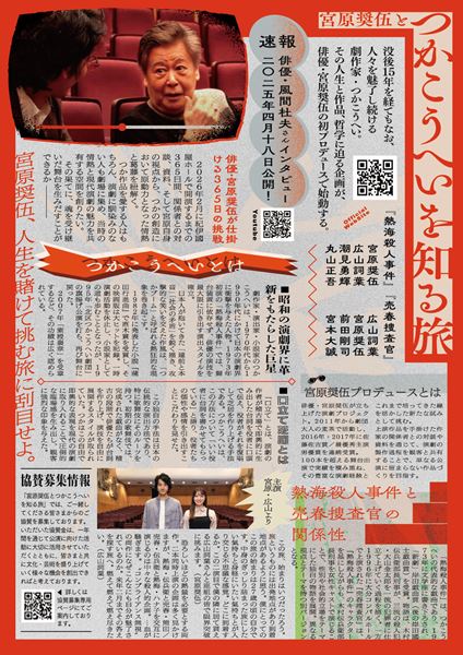 「北区つかこうへい劇団」に研修生として1年間在籍した経験を持つ宮原だが、今回の公演と並行して「つかこうへいを知る旅」と銘打ったプロジェクトを始動。つかにゆかりのある俳優や関係者へのインタビューなどを行なっている。なぜ、いまの時代につかこうへいの作品を発表するのか? 宮原、そして「売春捜査官」で主人公の女性部長刑事・木村伝兵衛を演じる広山詞葉の二人に話を聞いた。