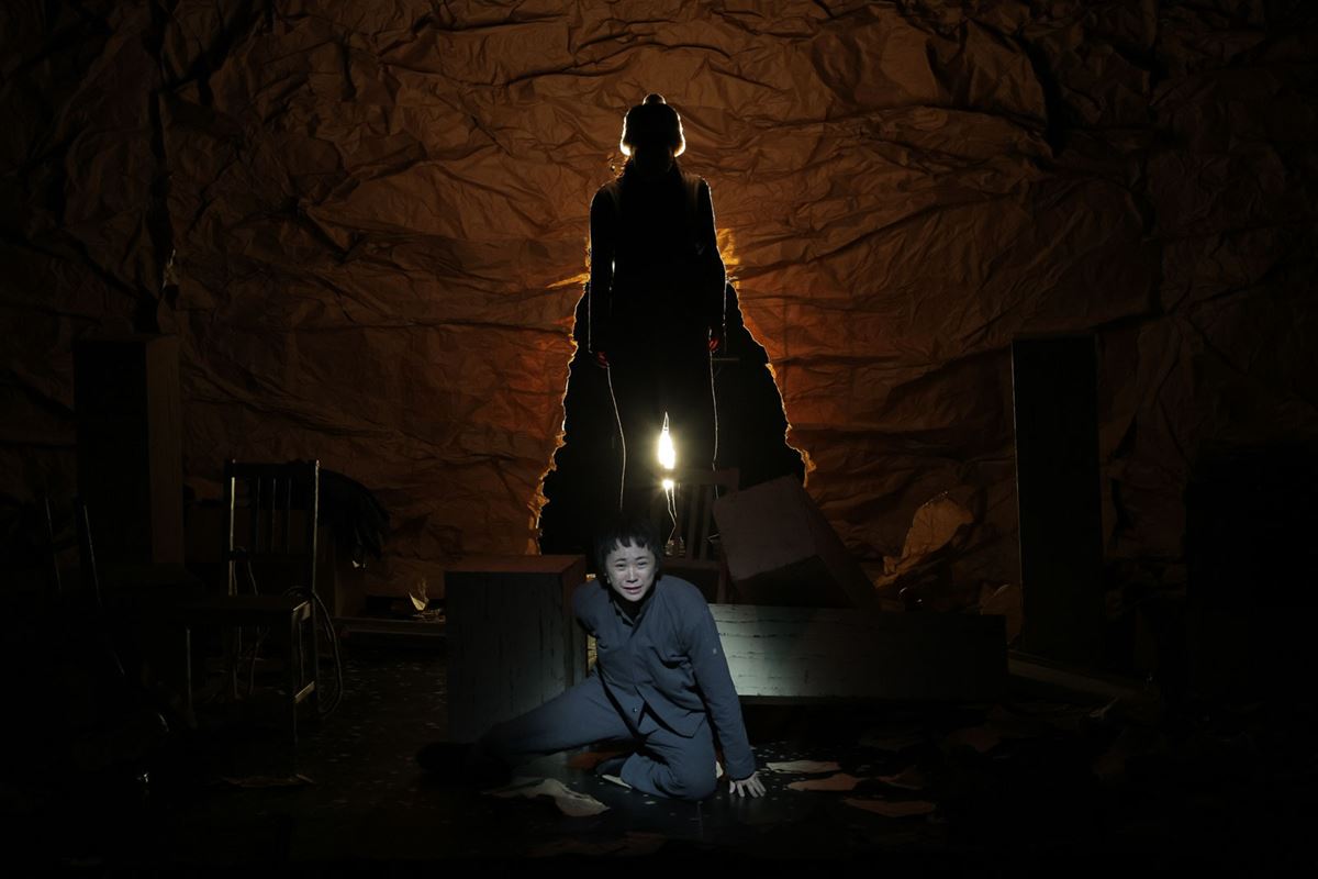 舞台セットいっぱいにワープロ原稿の文字が映し出されると、何とも言えない緊張感が漂い、ほの暗いステージ上をキャストがライトを持って動き回る様はどこか幻想的であり、ステージ上の机や柱などさまざまな物をキャストが動かして場面設定が動いていく様は小気味よいテンポの良さであり――。