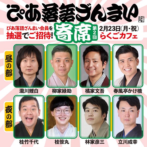 第2回は昼・夜の2部構成で、「ぴあ落語ざんまい」会員の中から昼・夜の部の各公演30名、合計60名(同行者を含む)を抽選で無料招待。昼の部には瀧川鯉白、柳家緑助、橘家文吾、春風亭かけ橋、夜の部には桂竹千代、桂笹丸、林家彦三、立川成幸が出演。注目の若手落語家総勢8名が、“今本当に観てほしい”演目を披露する。