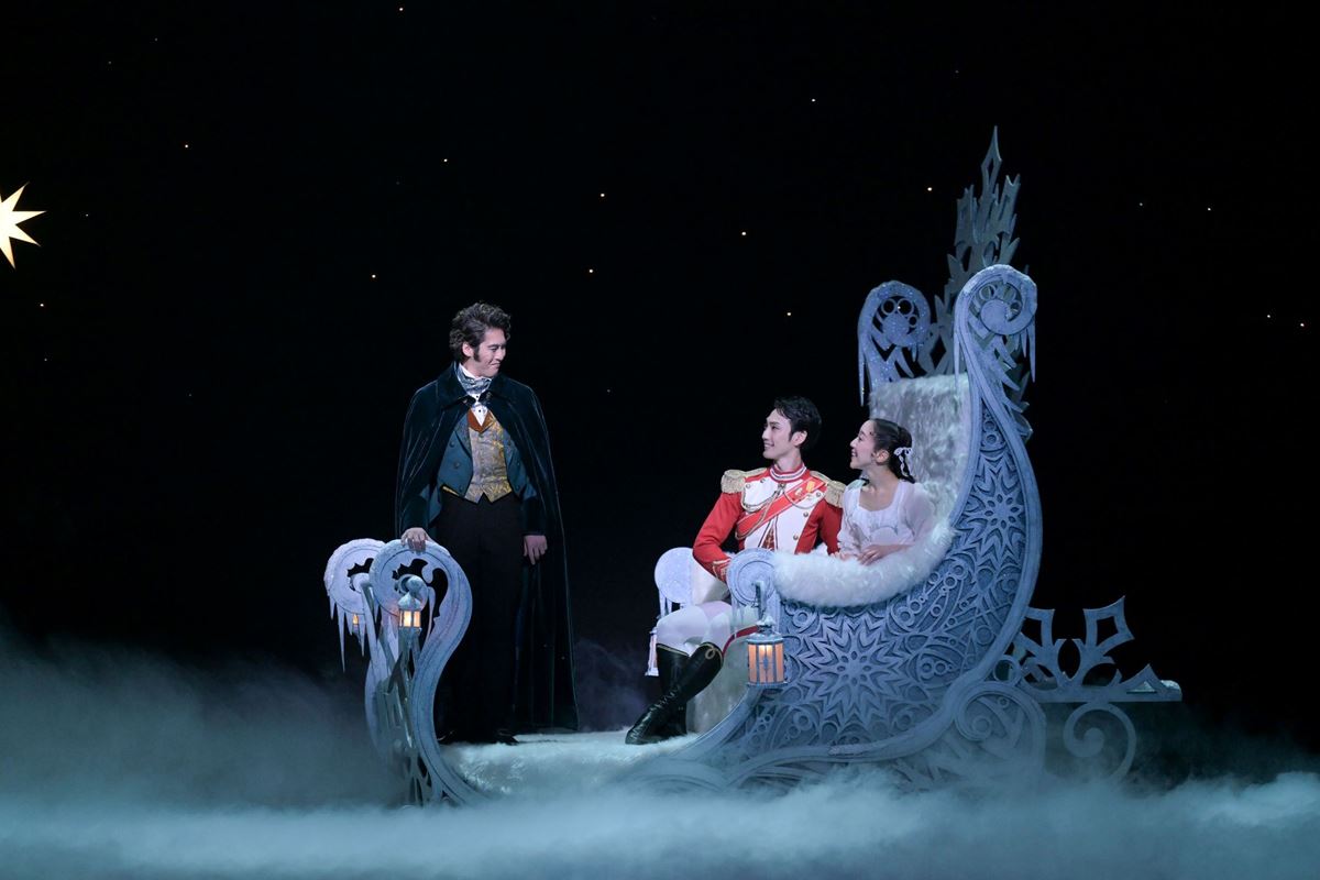 夢の中でクリスマスツリーがどんどん大きくなるシーンは工夫のしどころだが、目の前で魔法の力が働くのを実感させるアイデアで、劇場全体を夢の世界へと引き込む。ねずみたちとの熾烈な戦いで負傷したくるみ割り人形は、ドロッセルマイヤーの魔法で王子に変身、クララとともに雪の国へ。雪の結晶がデザインされた幻想的な空間で展開される雪の結晶の踊りは、サラサラとした雪片が風に舞う様子を女性ダンサーたちがスピード感ある振付で体現、7月の『ジゼル』ロンドン公演でも高い評価を得たコール・ド・バレエの力が、大いに発揮される。