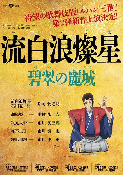 すべて見る歌舞伎「流白浪燦星(ルパン三世)」の第2弾となる新作のタイトルが、『流白浪燦星 碧翠の麗城(へきすいのれいじょう)』に決定。また、片岡愛之助が演じる流白浪燦星とともに、作品を盛り上げる出演者の配役が明らかとなった。